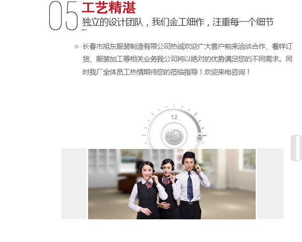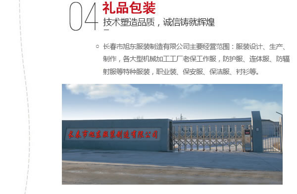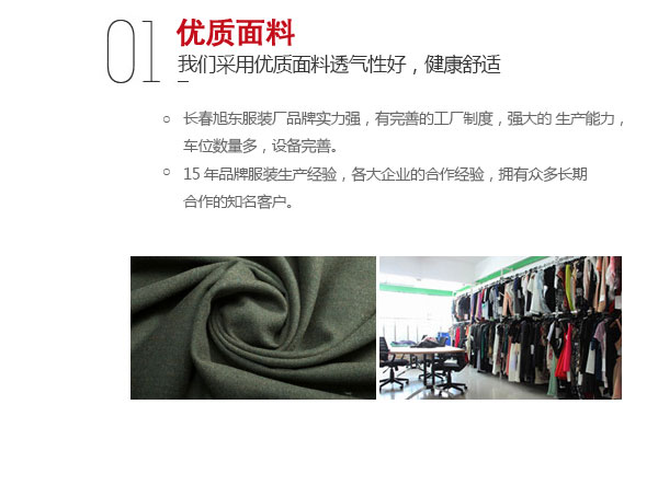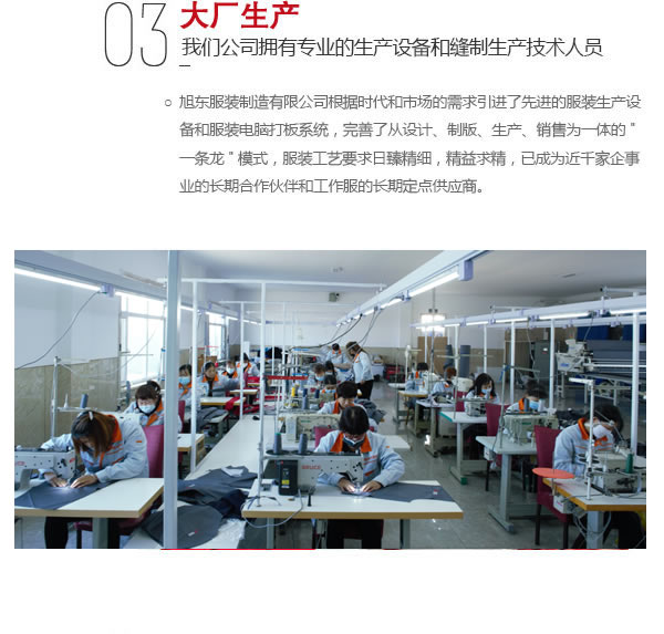 吉林省長春市旭東服裝廠,電話:13578777918,提供工作服,工裝定制,勞保服,保安服,職業(yè)裝定制,本公司是一家集生產(chǎn),設(shè)計,制作,銷售為一體的多元化公司。長春市旭東服裝制造有限公司成立于2003...[查看更多]